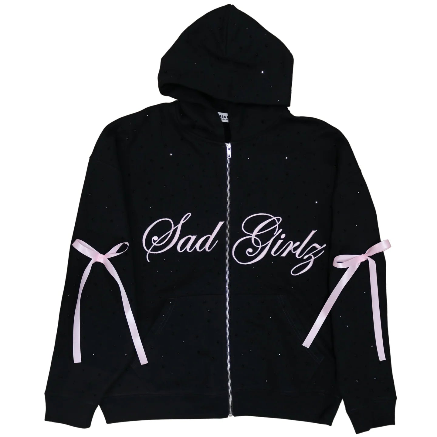 Turn casual into unforgettable with the Rhinestone Hoodie – Sad Girlz Edition. Designed with a relaxed zip-up fit, this hoodie is covered in subtle rhinestone details that shimmer with every move. The soft fleece interior keeps you cozy, while pink satin ribbon ties on each sleeve add a playful, feminine touch. Finished with the iconic Sad Girlz script across the chest, it’s the perfect mix of comfort and statement style.